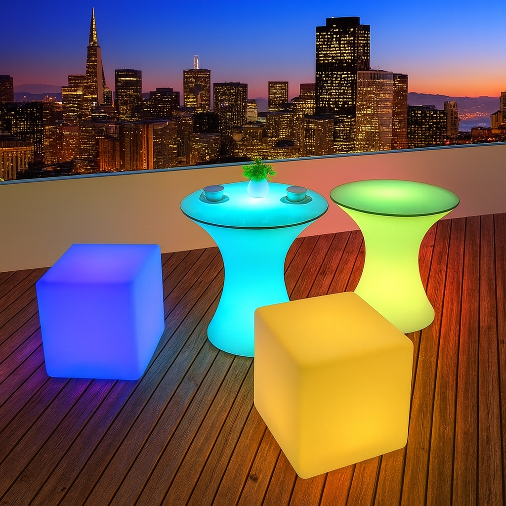 Create your ambiance with neon! Add flare to your event with our premium waterproof, cool-to-touch LED color changing chairs & cocktail tables.